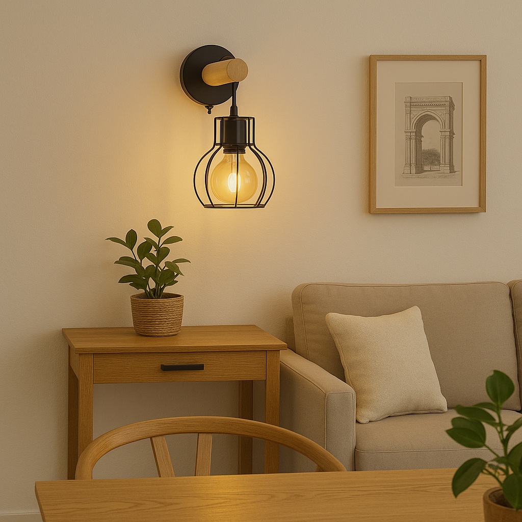 "Cette applique diffuse une lumière chaude qui apporte immédiatement une atmosphère conviviale, idéale dans un salon, un couloir ou un coin lecture. Son mélange de métal noir et de bois se marie particulièrement bien avec des intérieurs aux tonalités naturelles, des meubles en chêne clair et des textiles beiges ou crème. Placée au-dessus d’une console, elle structure discrètement le mur tout en évitant l’encombrement visuel d’une lampe de table. Elle peut aussi être installée par paire. Pour conserver l’esprit chaleureux qui fait sa force, mieux vaut choisir une ampoule chaude à filament visible plutôt qu’une lumière blanche froide, qui casserait l’ambiance et rendrait la cage plus dure à l’œil.