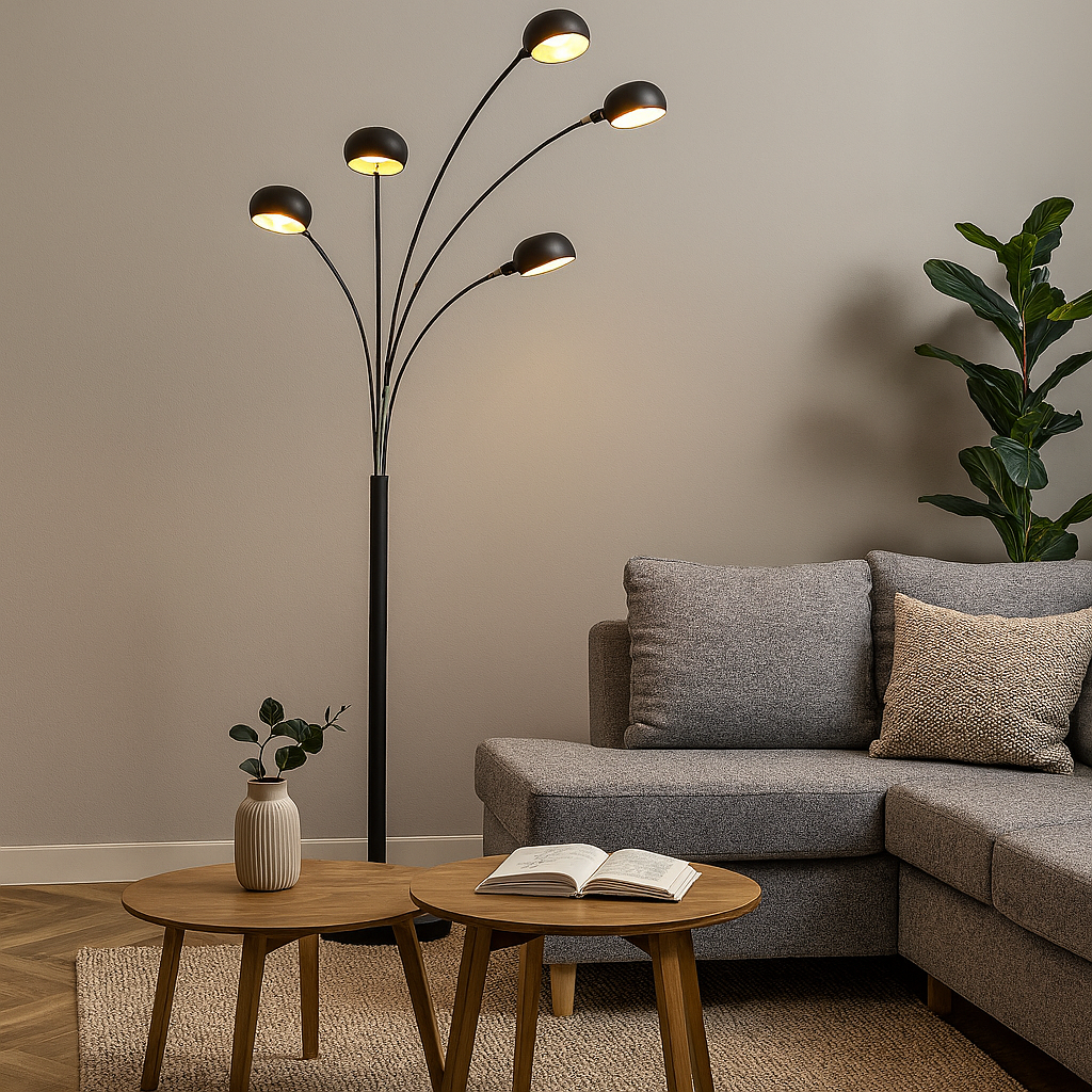 "Ce lampadaire arc à plusieurs bras apporte une élégance graphique et un équilibre parfait entre design et fonctionnalité. Ses courbes légères et sa finition noire mate en font une pièce maîtresse dans un salon contemporain ou un intérieur au style scandinave. Installé près d’un canapé ou d’un fauteuil, il crée une lumière enveloppante et chaleureuse tout en structurant visuellement l’espace. Sa silhouette aérienne s’associe parfaitement à des matières naturelles comme le bois, le lin ou la laine, et se marie aussi bien à un mur clair qu’à des tons plus profonds.