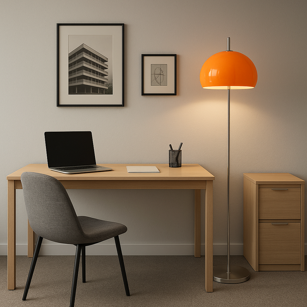 "Éclatant et raffiné, ce luminaire séduit par son abat-jour orange au charme rétro. Son design arrondi, inspiré des années 70, réchauffe instantanément l’atmosphère tout en apportant une touche de modernité à l’espace. La finesse de son pied métallique contraste avec la vivacité de la couleur, créant un équilibre parfait entre élégance et audace. Installé près d’un bureau, d’un canapé ou d’un fauteuil, il diffuse une lumière douce et chaleureuse. Son style vintage revisité s’intègre aussi bien dans un décor scandinave que dans un intérieur contemporain, où il devient un point focal lumineux plein de caractère.
