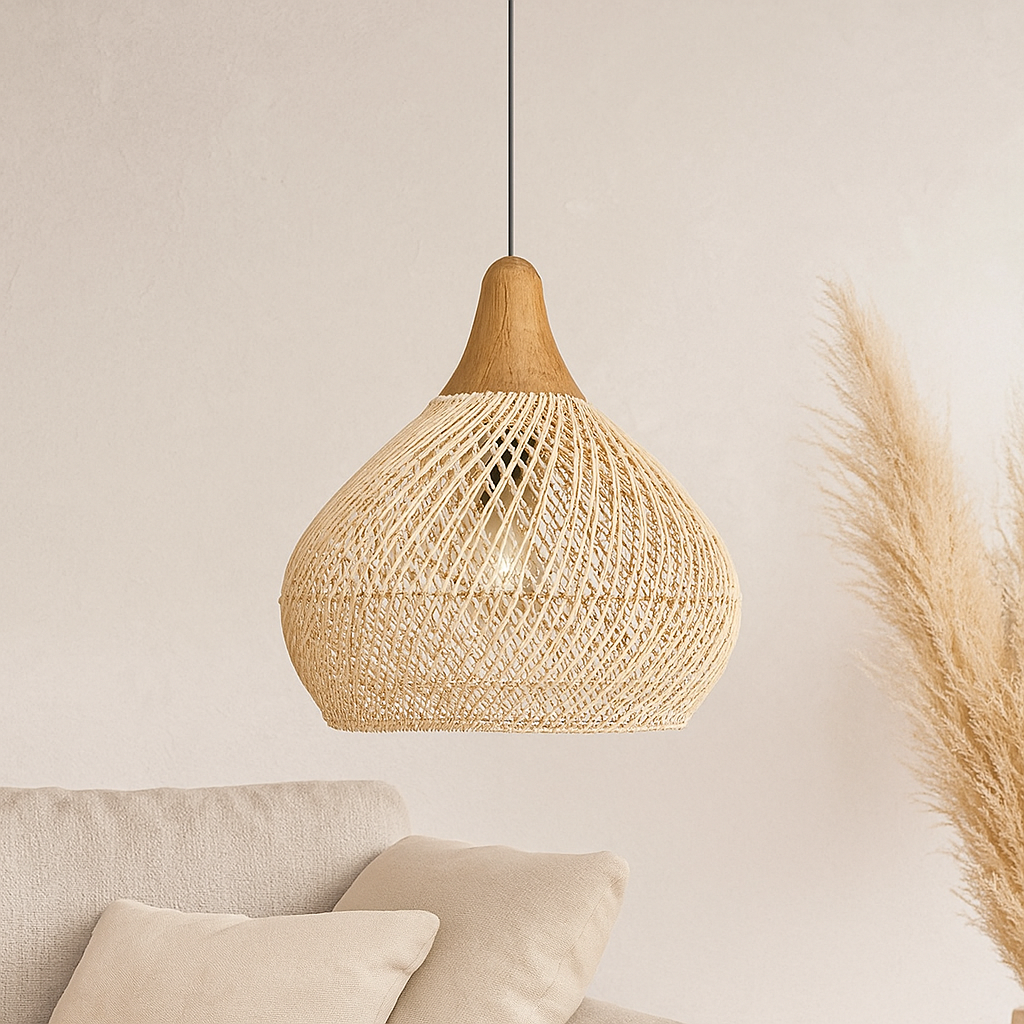 Suspension en matériau osier, conçue avec un tressage manuel. Compatible avec une ampoule à culot E27 (non incluse). Installation par cordon suspendu. Adaptée à différents espaces intérieurs tels que salon, chambre, bureau, hall ou espace de restauration.